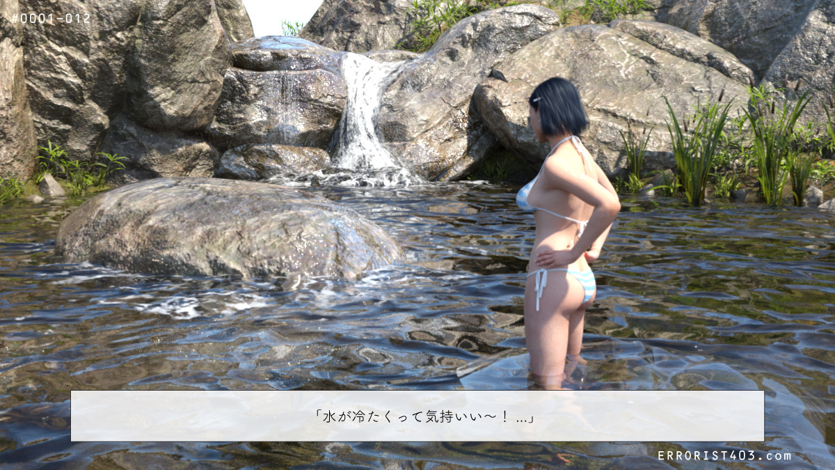 ストーニークリーク滝の下流は流れが緩やかで幅も広くなっており、水遊びに最適。佳菜子は全く人の気配がしないことに一抹の不安を覚えたが、ひとまず水着になって日光浴を楽しむことにした。