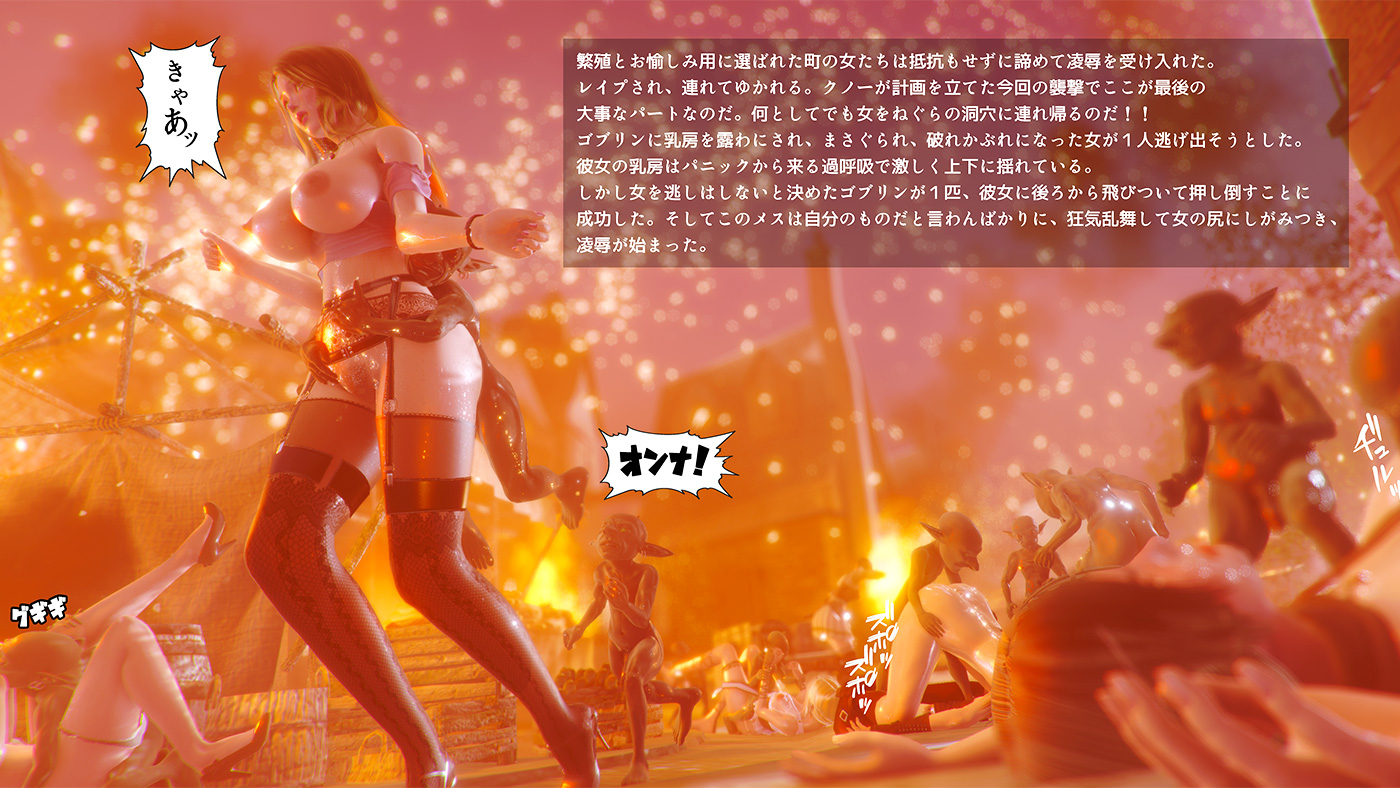 この作品「The Ultimate Goblin Gangbang3」では、女冒険者や町娘、村娘、女町長らがゴブリンの群れの手に落ちて、ゴブリンの巣穴に連れ込まれて輪姦されるストーリーがCGイラストで描かれます。ゴブリンに輪姦レイプされた女達は孕まされてゴブリンの赤子を何匹も繰り返し産み落とす…。オスのゴブリンの群れが人間とエルフの女性を攫い、ゴブリンの数を増やすために凌辱の限りを尽くす、そのあらすじをサンプル画像と共に御覧ください⬇️⬇️⬇️。